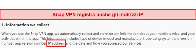 I Termini di servizio di Snap VPN stabiliscono la raccolta di numerose informazioni identificabili: